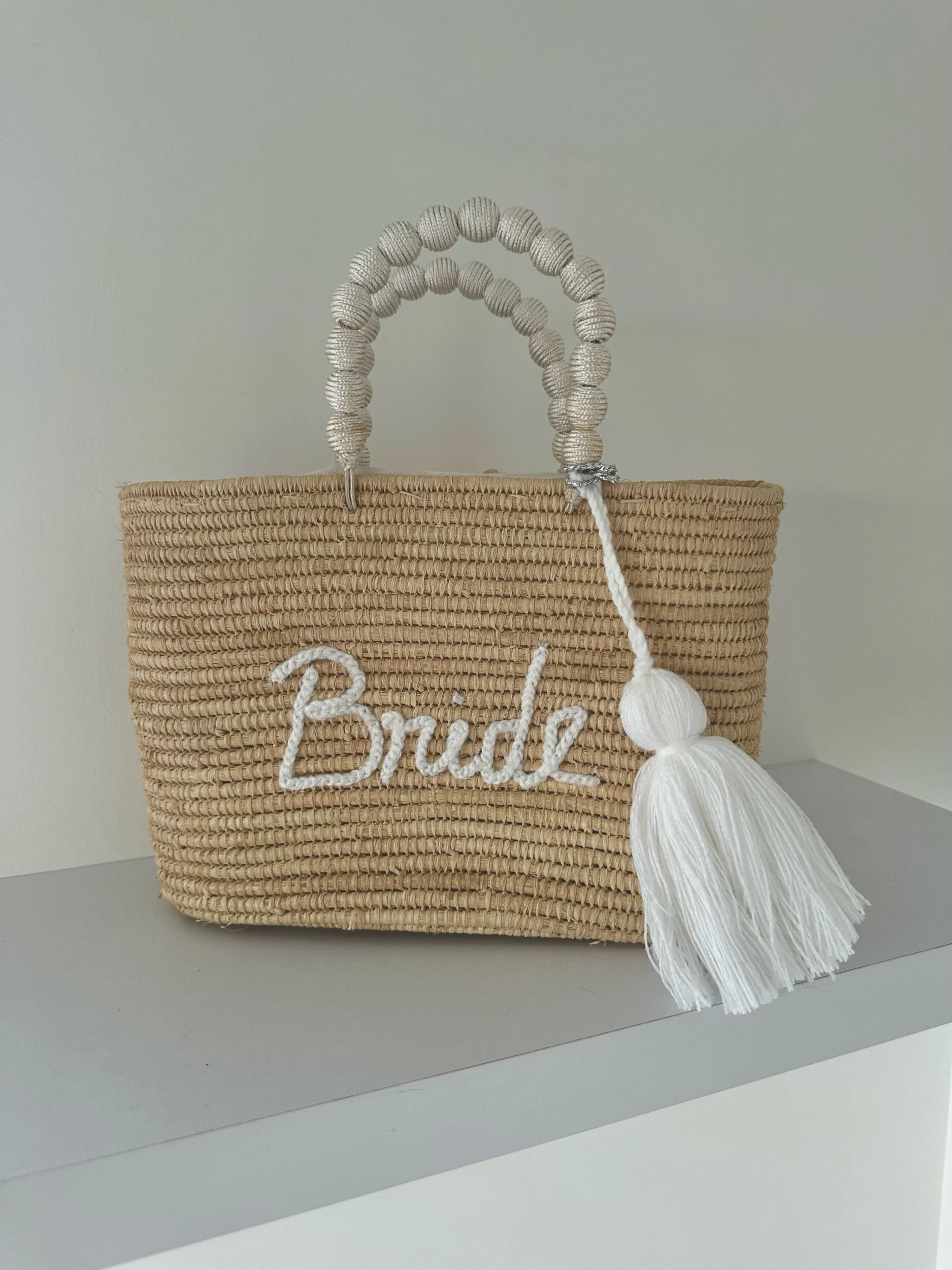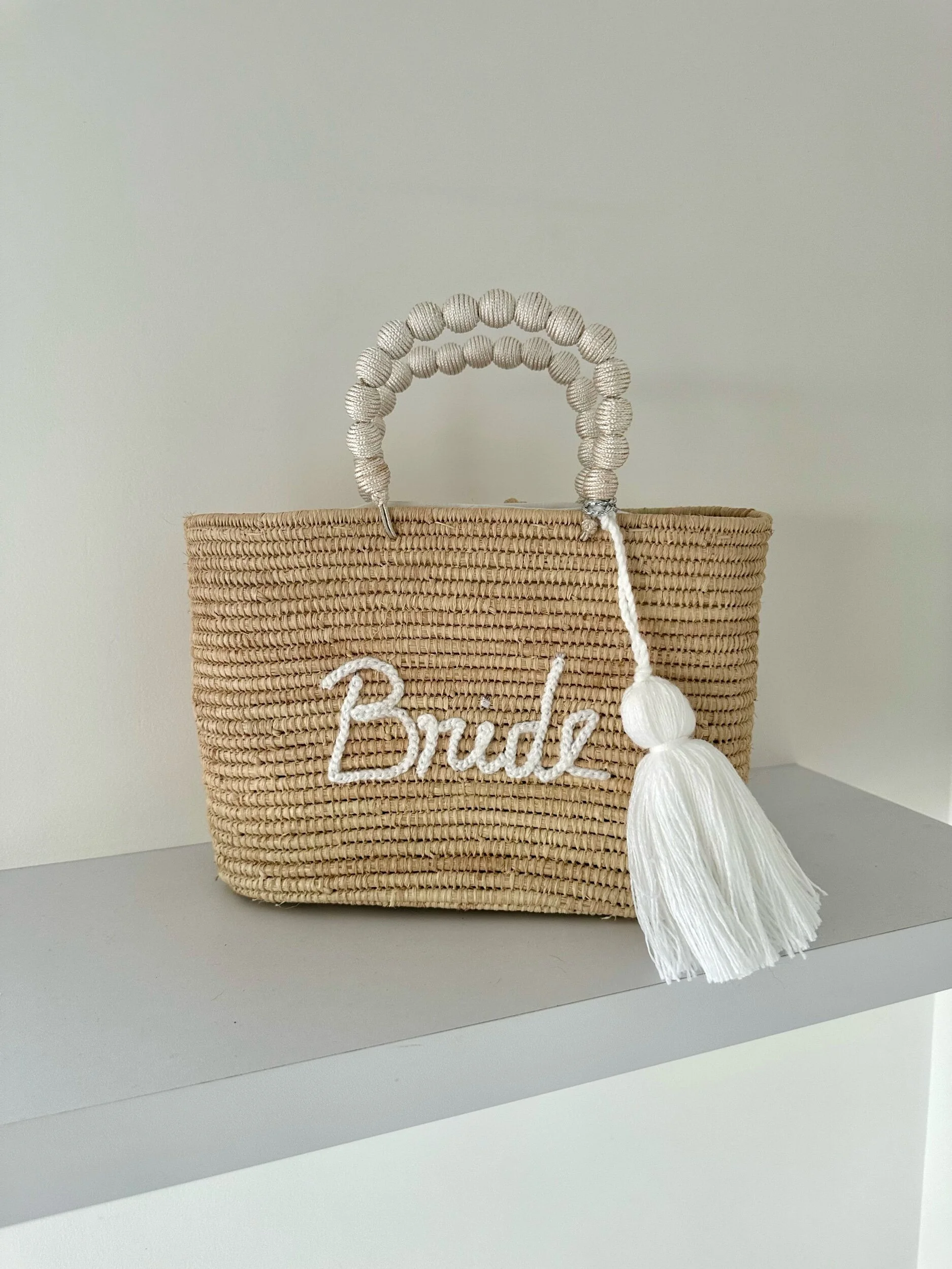 The raffia palm bride basket with beaded handles is a stunning fusion of natural materials and intricate craftsmanship.