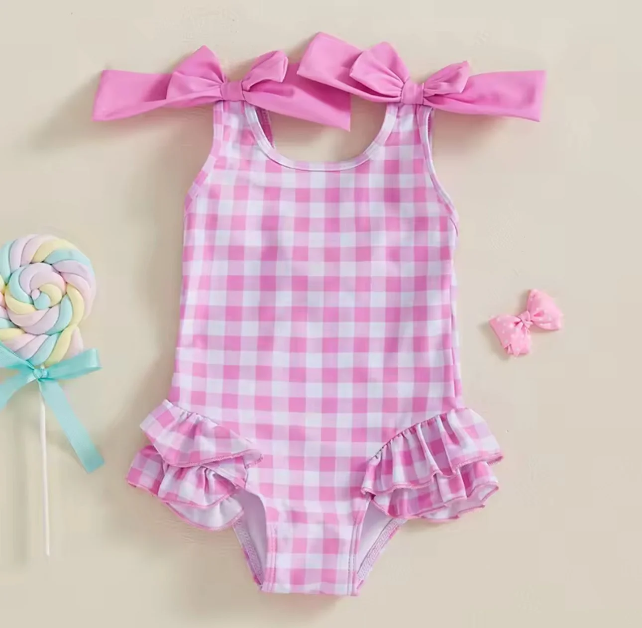 Sweet summertime perfection — our Gingham Bow Ruffle Swimsuit is made for sunshine, sandcastles, and poolside giggles. Designed in classic pink and sky-blue checks, this adorable one-piece features statement shoulder bows and soft ruffle detailing at the legs for a playful, girly touch.