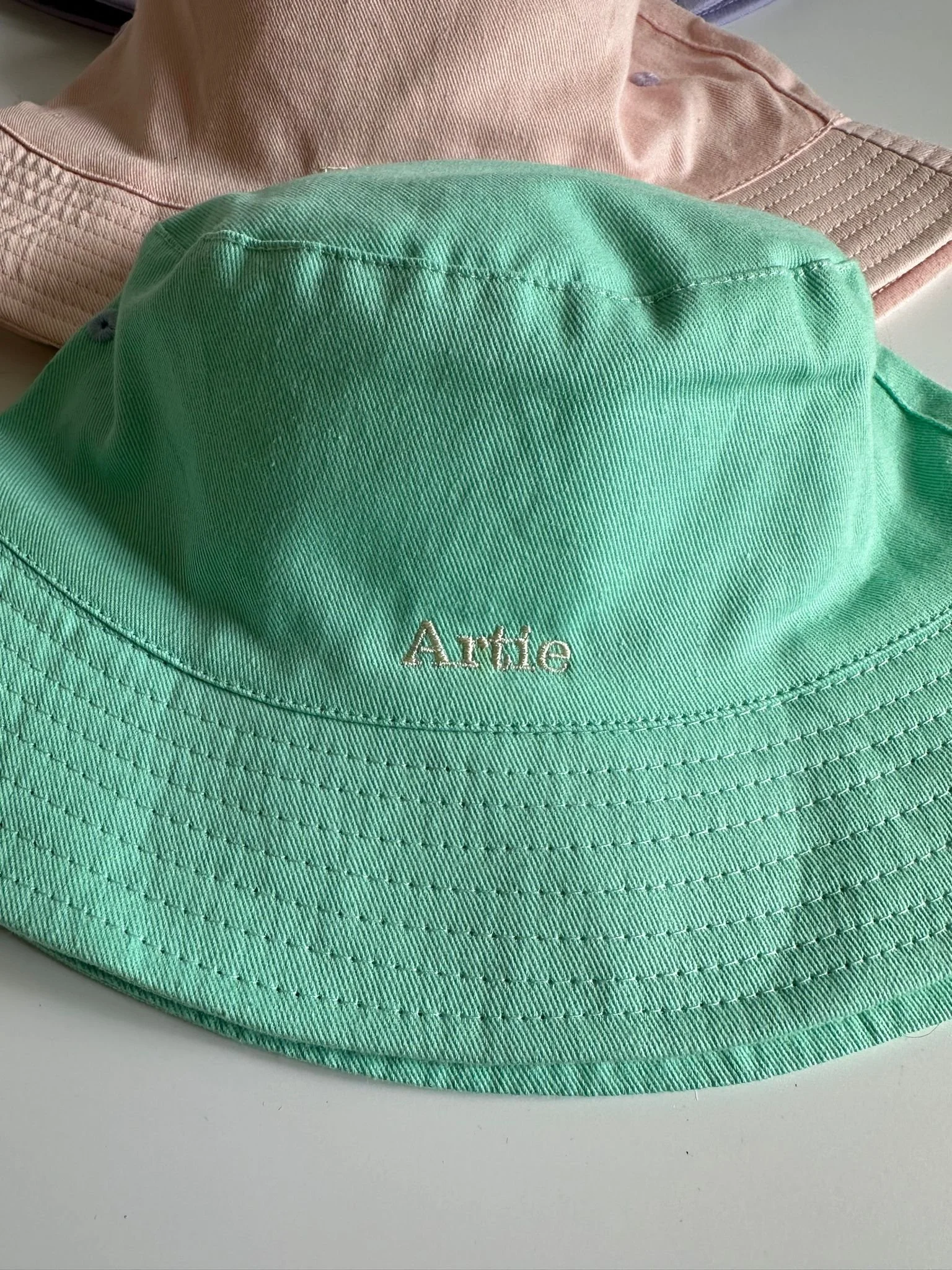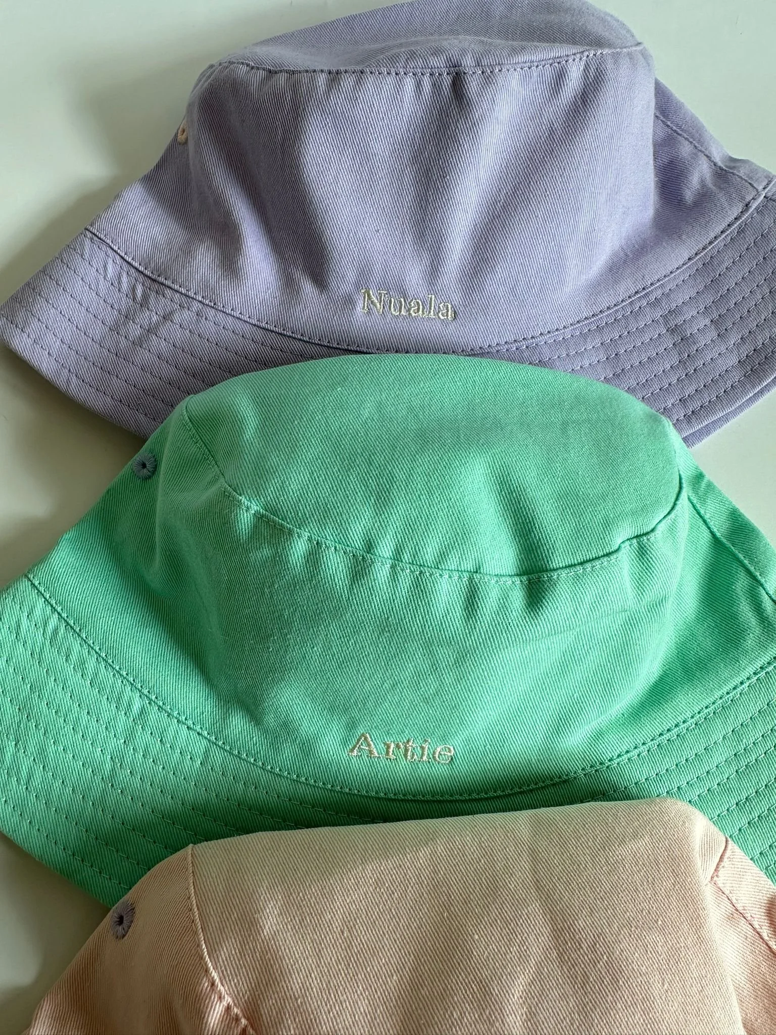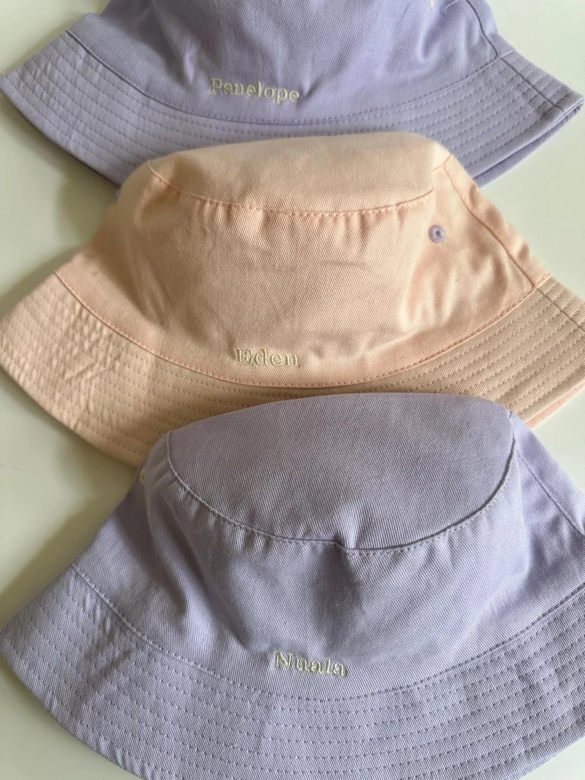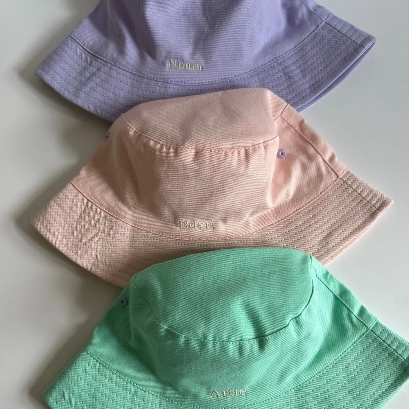 Our children's unisex personalised bucket hat are available in lilac, mint & pink, made from soft and breathable cotton, this hat features a wide brim to provide ample shade and protection.